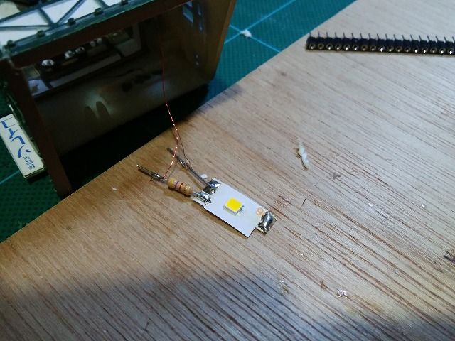 内側に通ったポリウレタン線を手繰り寄せて屋根側に寄せ、ライトユニットをハンダします。