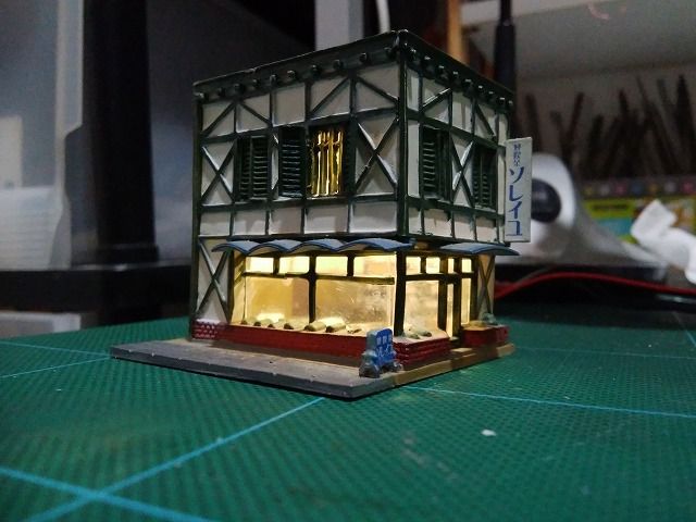TOMIXの住宅とジオコレの喫茶店を組み合わせ、和風の店舗にしています。